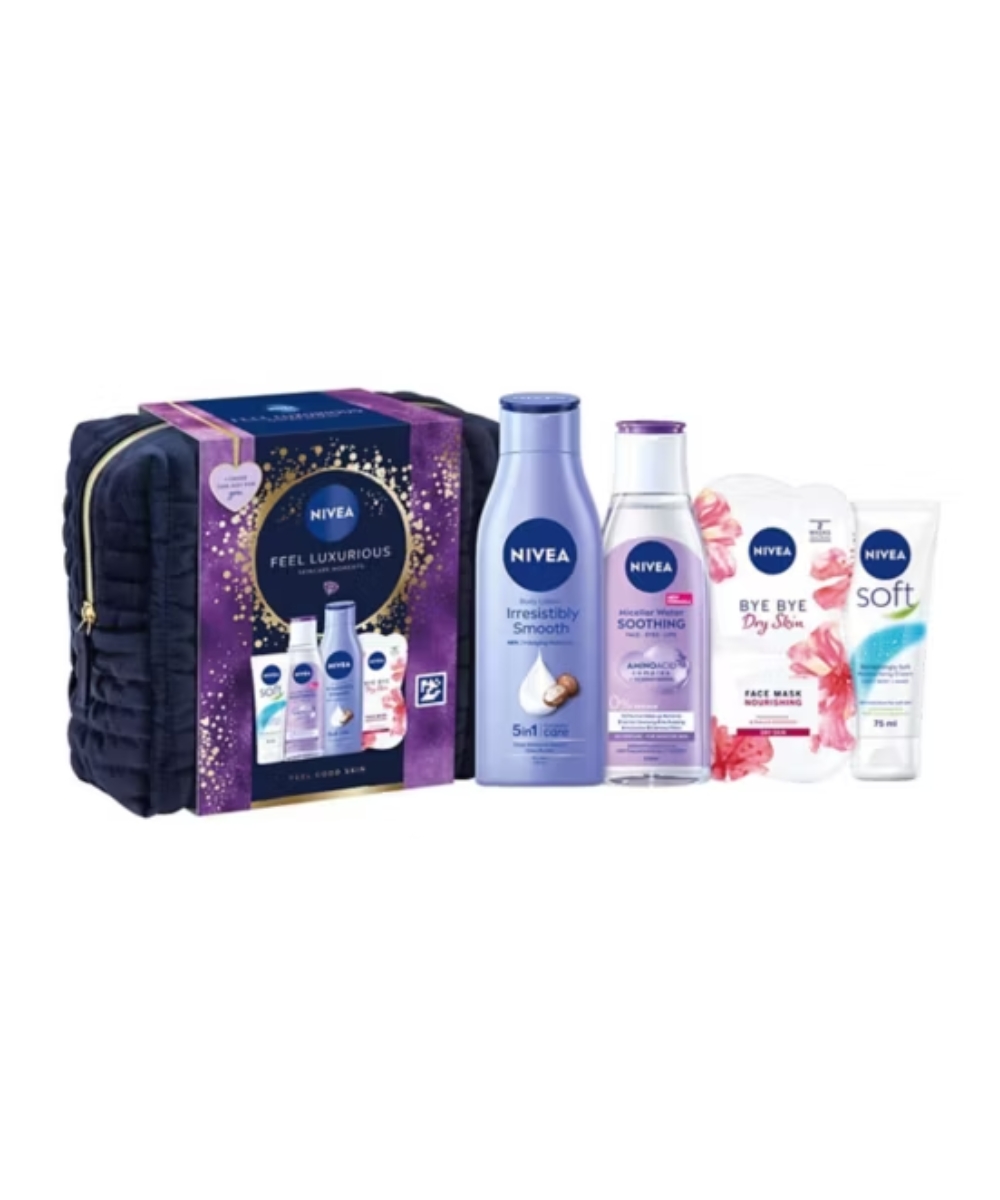 Indulge in a nourishing skincare experience with our NIVEA FEEL LUXURIOUS gift set which includes everything you need for soft, smooth and pampered skin, all wrapped up in a beautiful quilted cosmetic bag. This set includes the Soothing Micellar Water (Sensitive Skin), Irresistibly Smooth Body Lotion (250ml), Bye Bye Dry Skin Nourishing Face Mask for Dry Skin x2 and the cult favourite NIVEA Soft Moisturising Cream Tube.