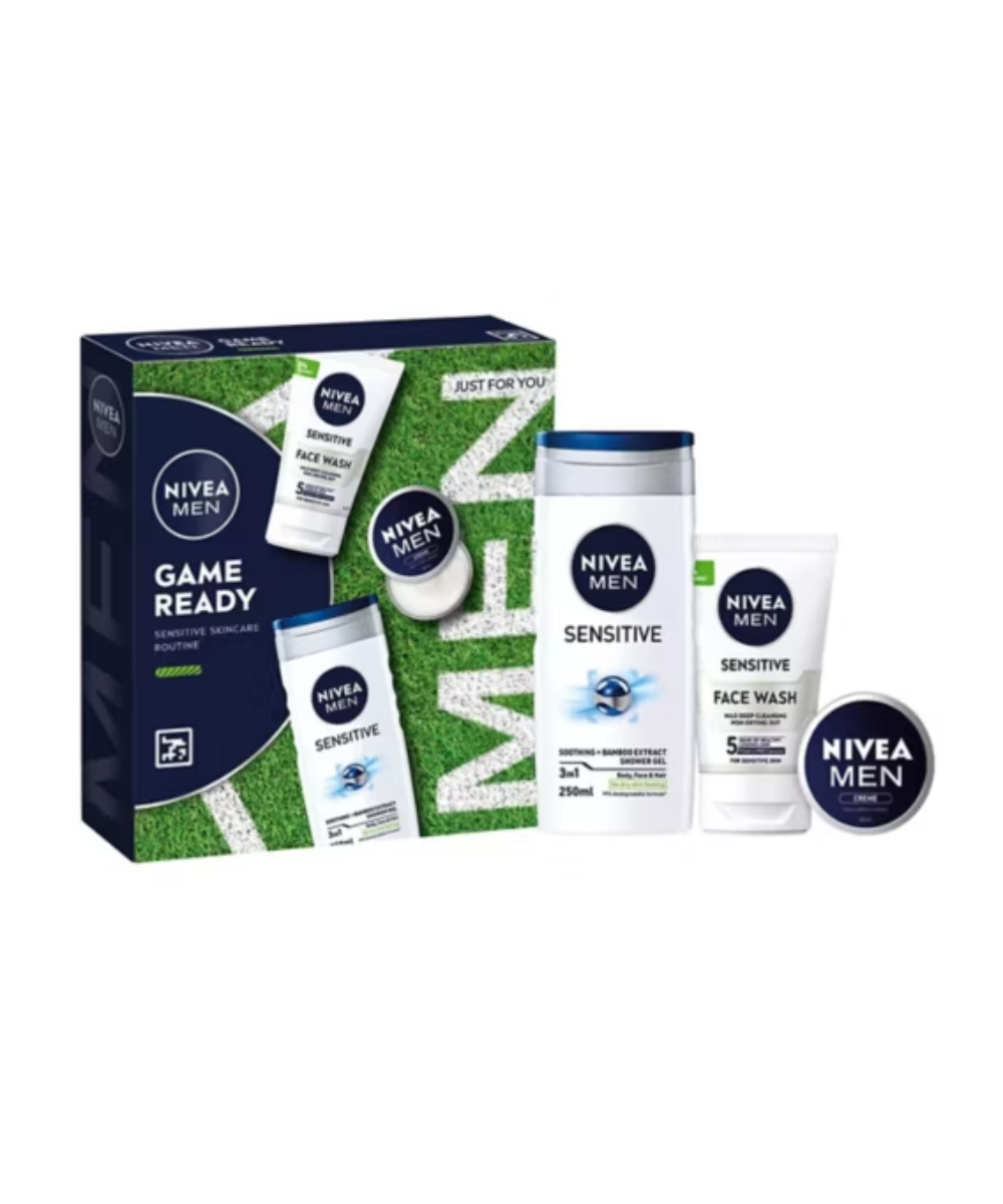 Stay ahead of the game with this NIVEA MEN GAME READY gift set which includes all the skincare essentials for those who like to keep active. The full set includes the Sensitive Shower Gel with Bamboo extract, Sensitive Face Wash with Vitamin PRO complex and the NIVEA Men Crème for the face, hands and body.